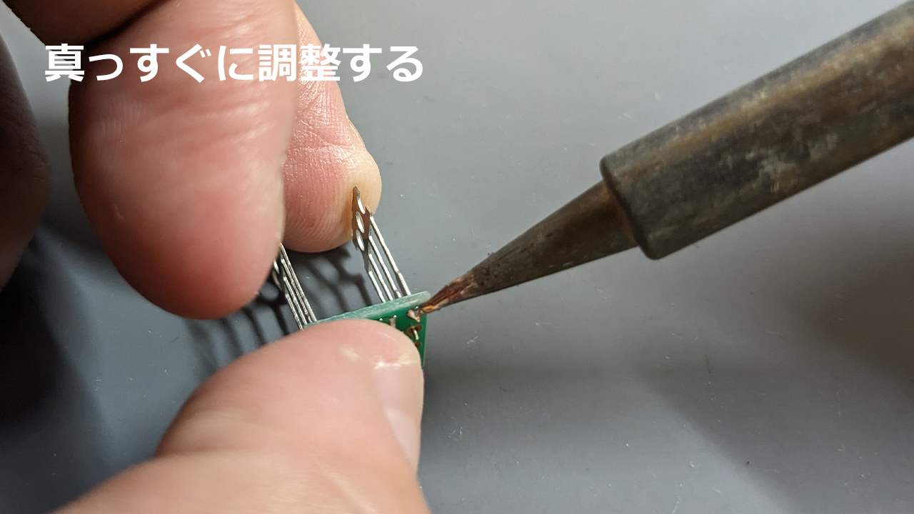 もしズレている場合は、仮止めしたところにはんだごてを当てて、リードフレームの位置を調整します。