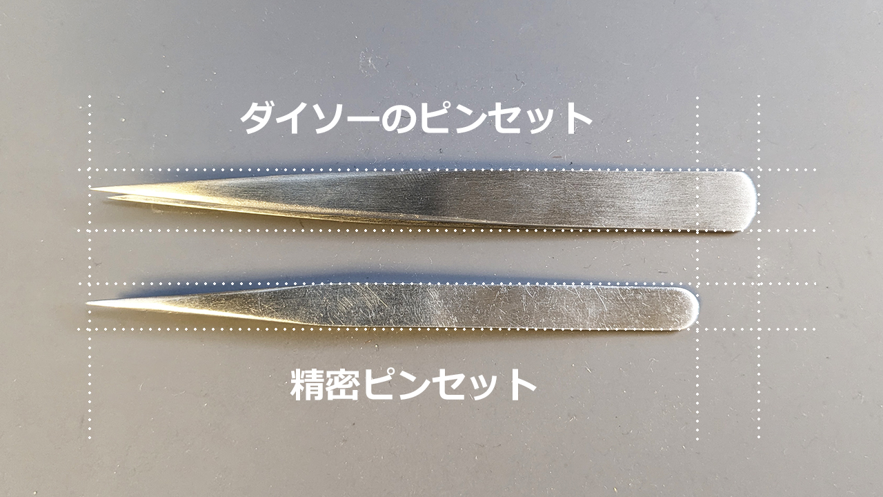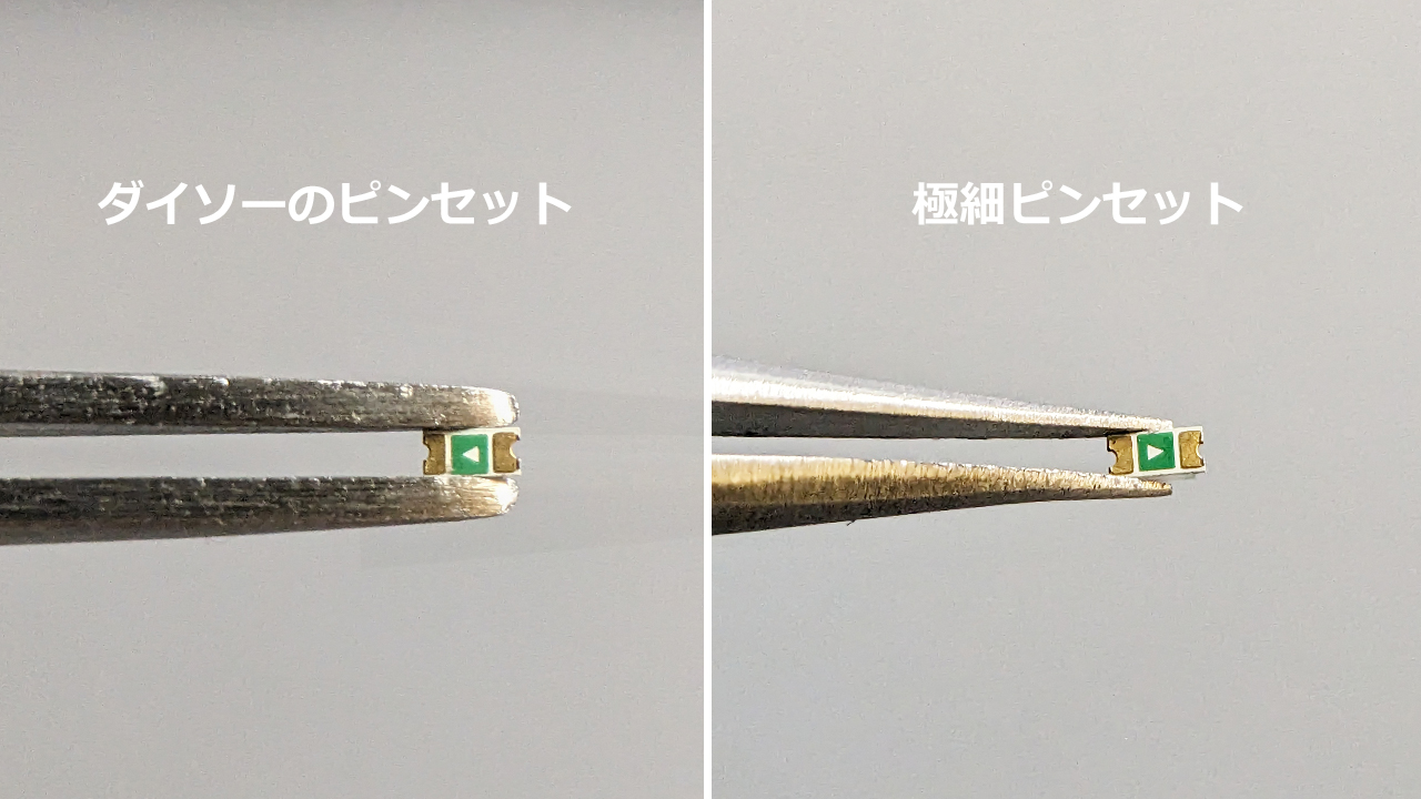 とはいえ、電子工作入門者であれば、ダイソーのピンセットでも十分です。