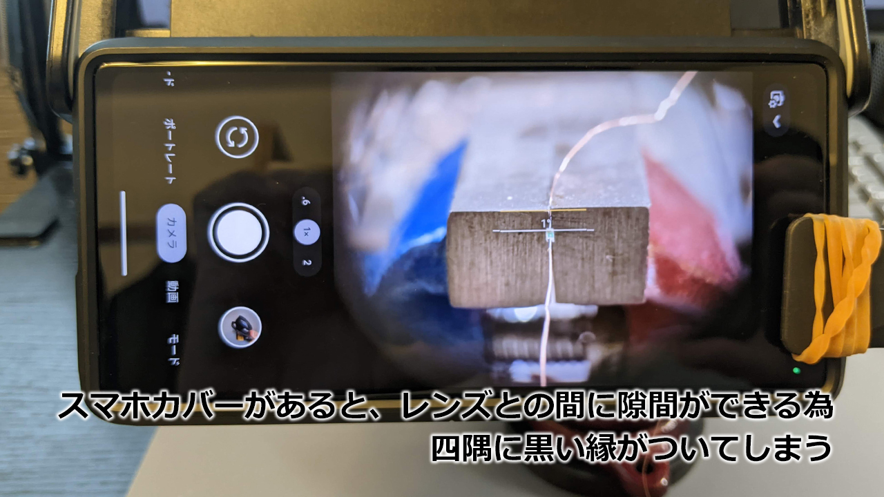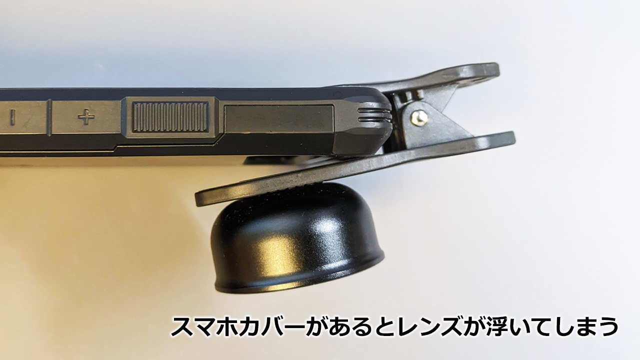 スマホカバーの上から外付けレンズを取り付けると、スマホのレンズと外付けレンズの間に少し隙間が空きます。