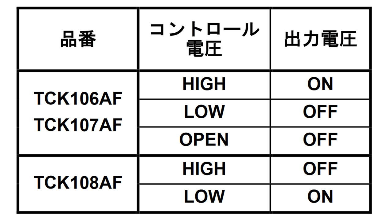 TCK106AF/TCK107AFは、CONTROLピンに入る信号が「HIGH」のときにスイッチが「ON」、TCK108AFは、CONTROLピンに入る信号が「LOW」のときにスイッチが「ON」となります。