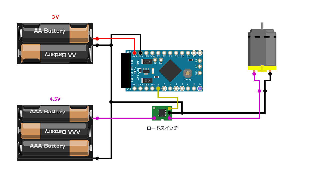 ロードスイッチを使えば、マイコンのピンから出力される微弱電流をトリガーにして、モーターが必要とする電流を流すことができます。