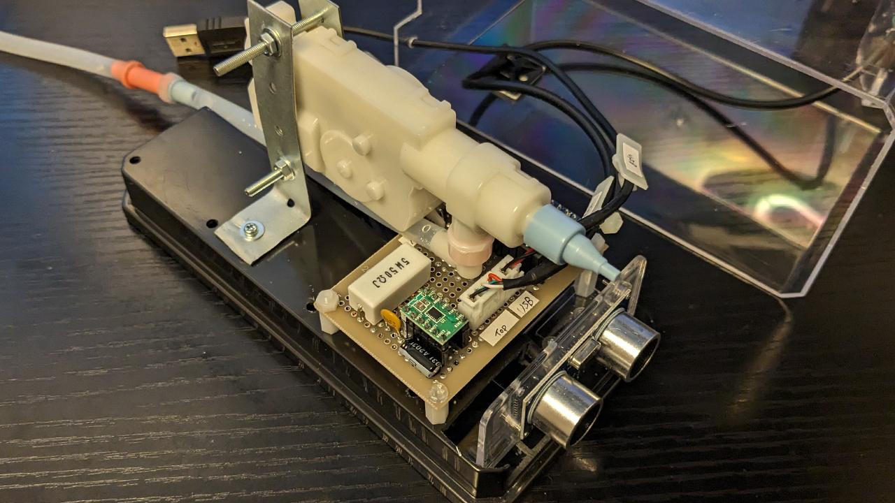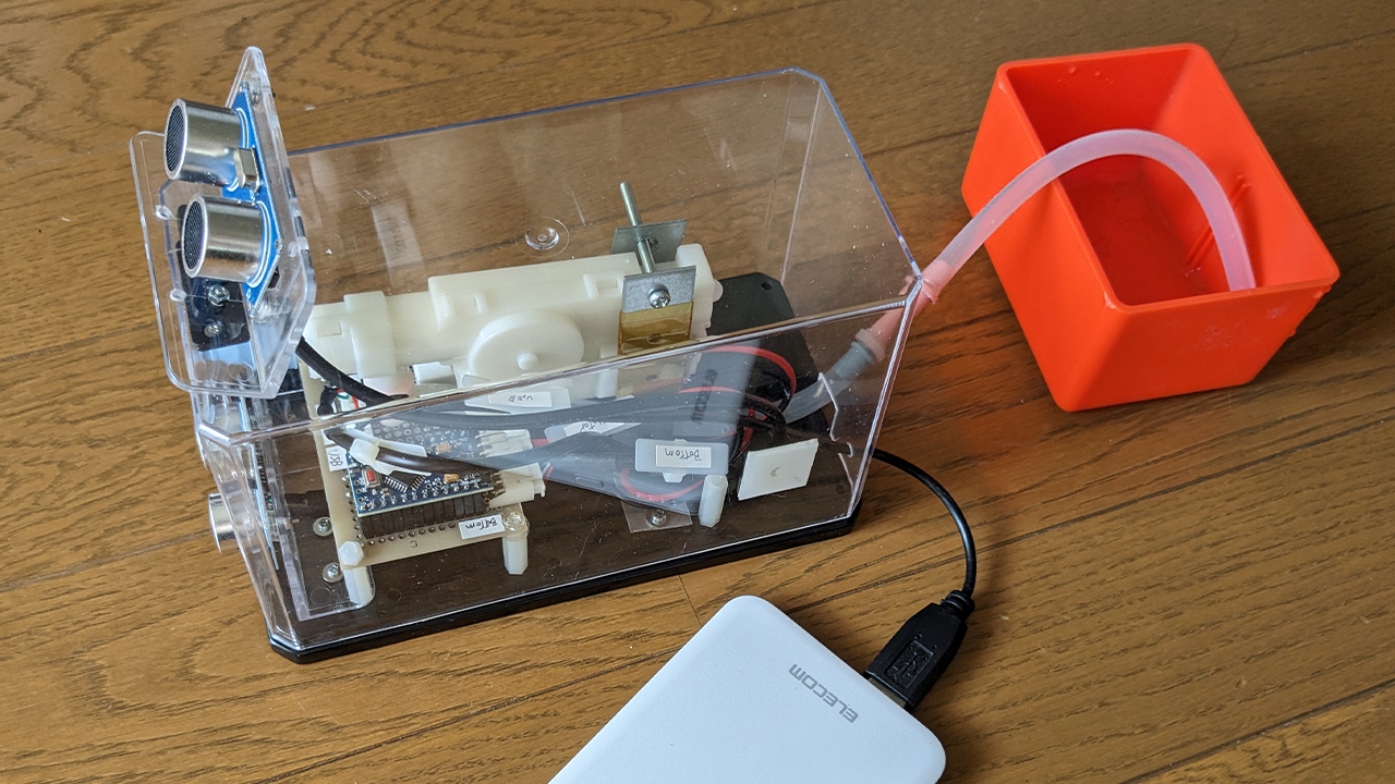 超音波センサーに反応があると、電動水鉄砲から水が発射される装置を作りました。