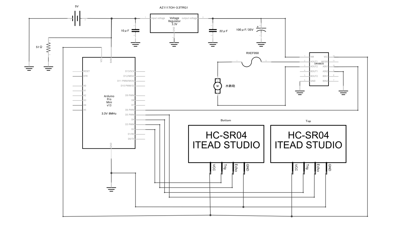 今回は、メイン制御を行うマイコンに3.3VのArduino Pro miniを使用しているため、新タイプの3Vに対応した超音波センサー(HC-SR04)を使用しました。