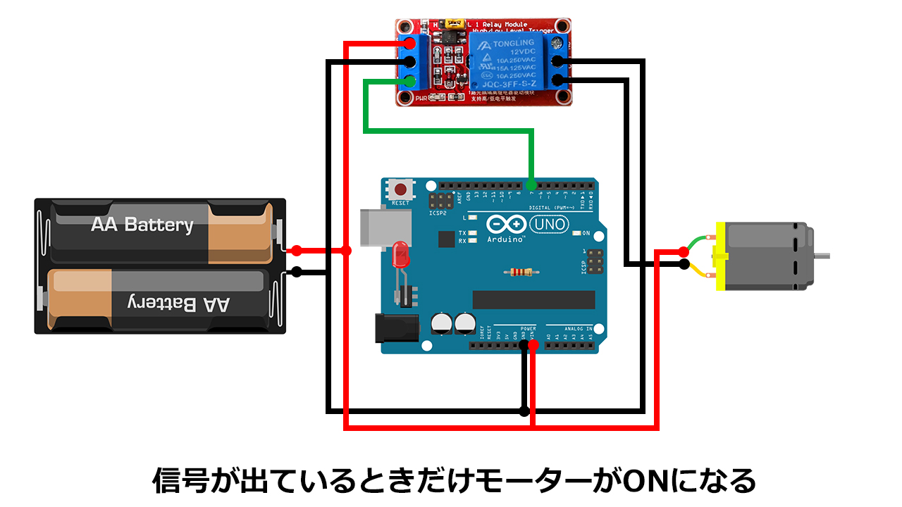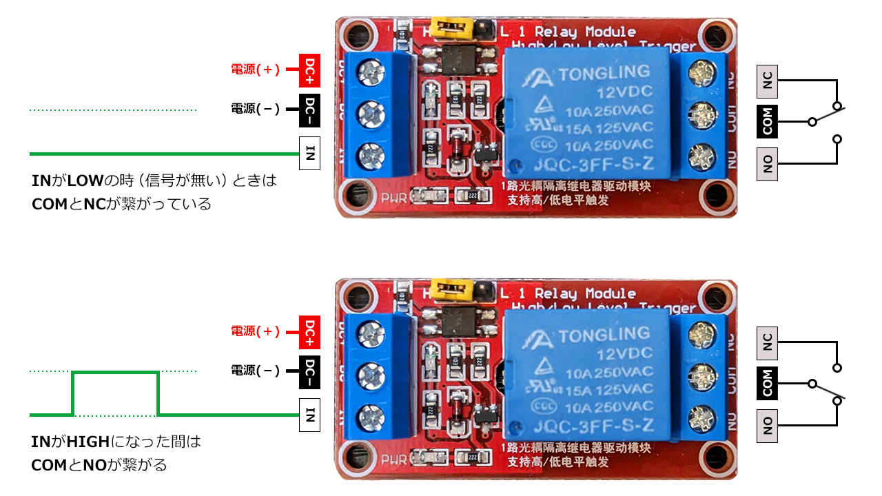 - NO(ノーマルオープン) ⇒ 信号がONのときに繋がる配線