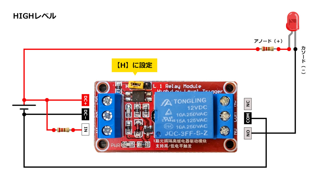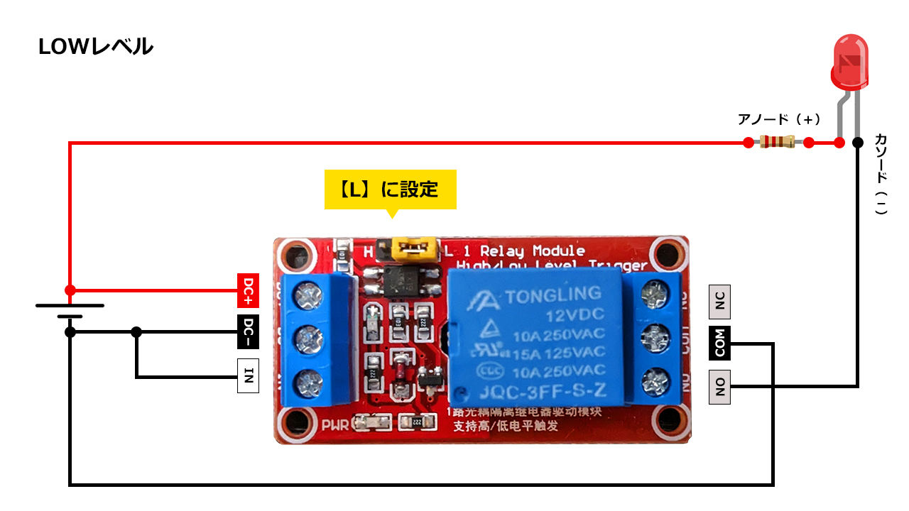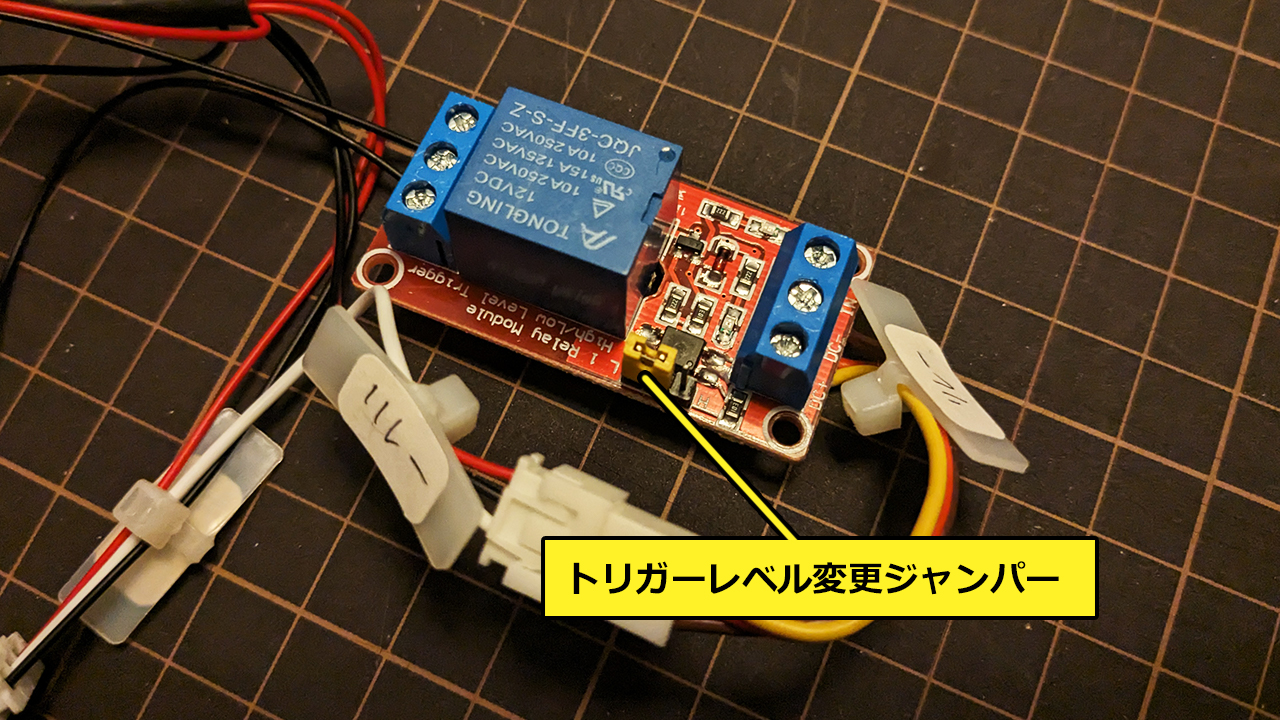 今回使用するフォトカプラ付きリレーモジュールは、あらかじめジャンパーによる設定が必要です。