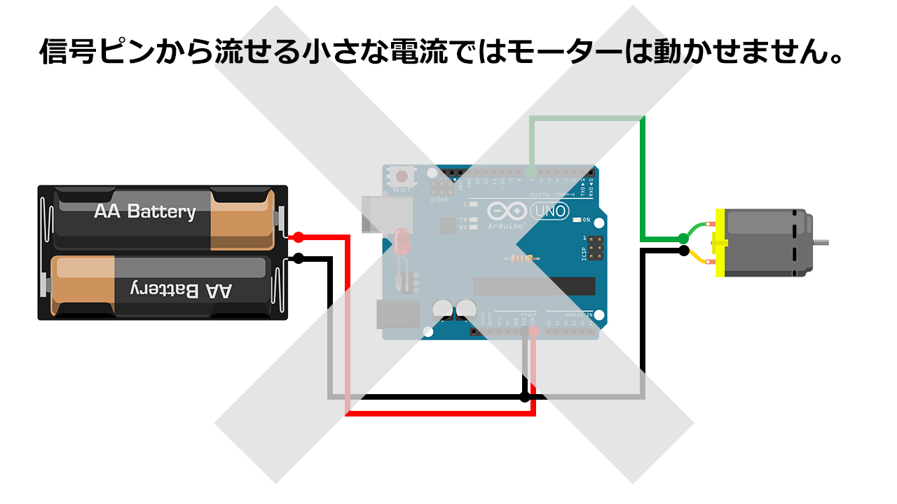 このまま信号をモーターに繋いだとしても、電流不足でモーターを動かすことはできません。