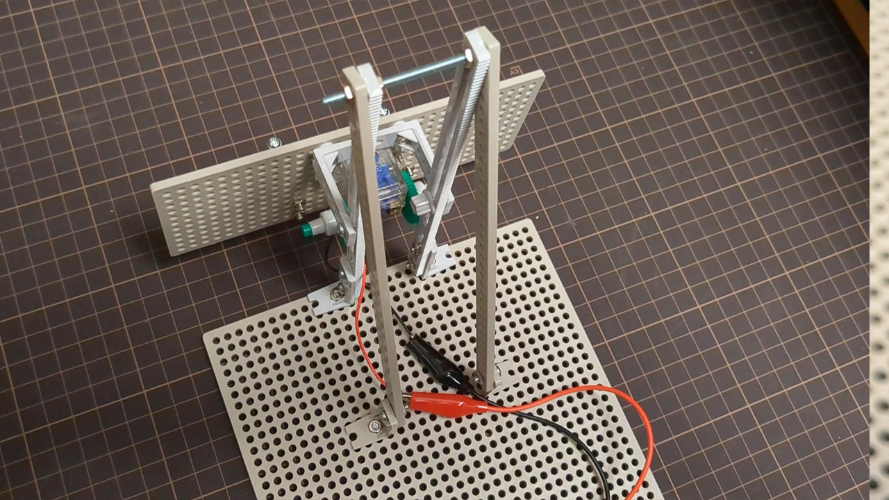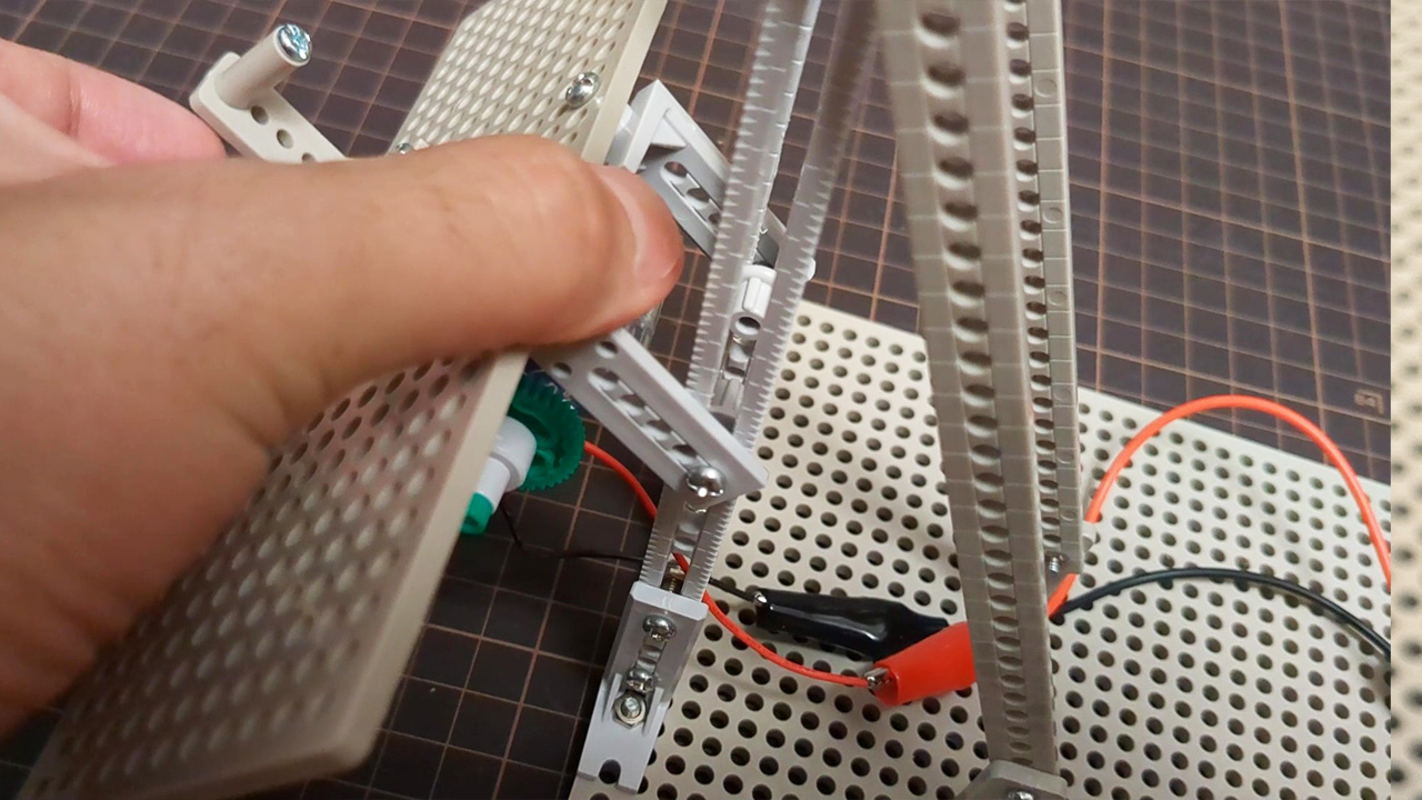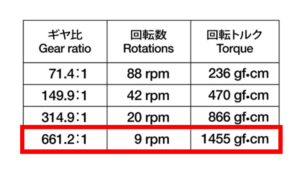 ただし、乾電池を2個使用して3Vでモーターを可動させ、ギヤボックスのギヤ比は最もトルク力のある「661.2:1」のローギヤに設定しています。