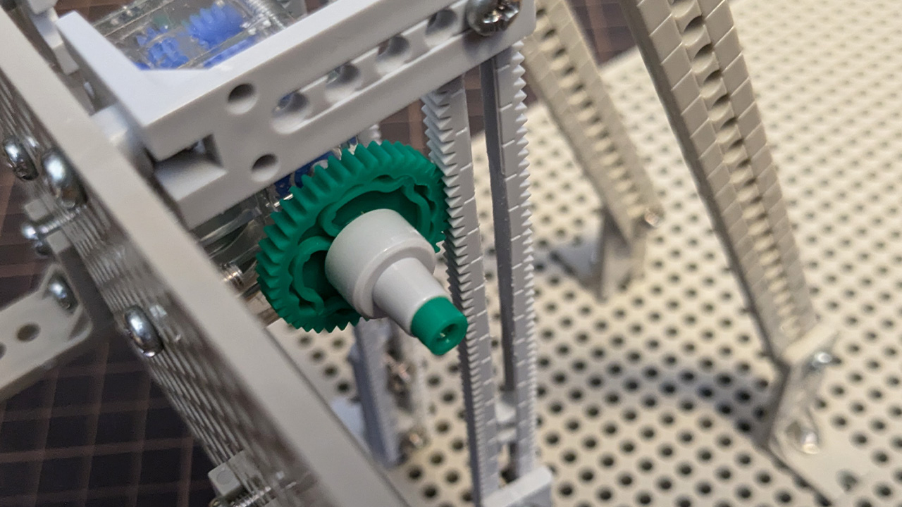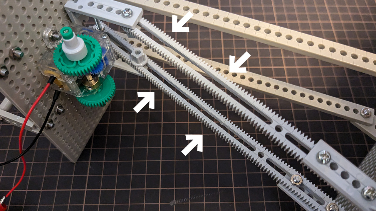 ラック(横に長く直線状に歯が切られた板)とピニオン(丸い小さな歯車)を使って、モーターの回転運動を直線運動に変えています。