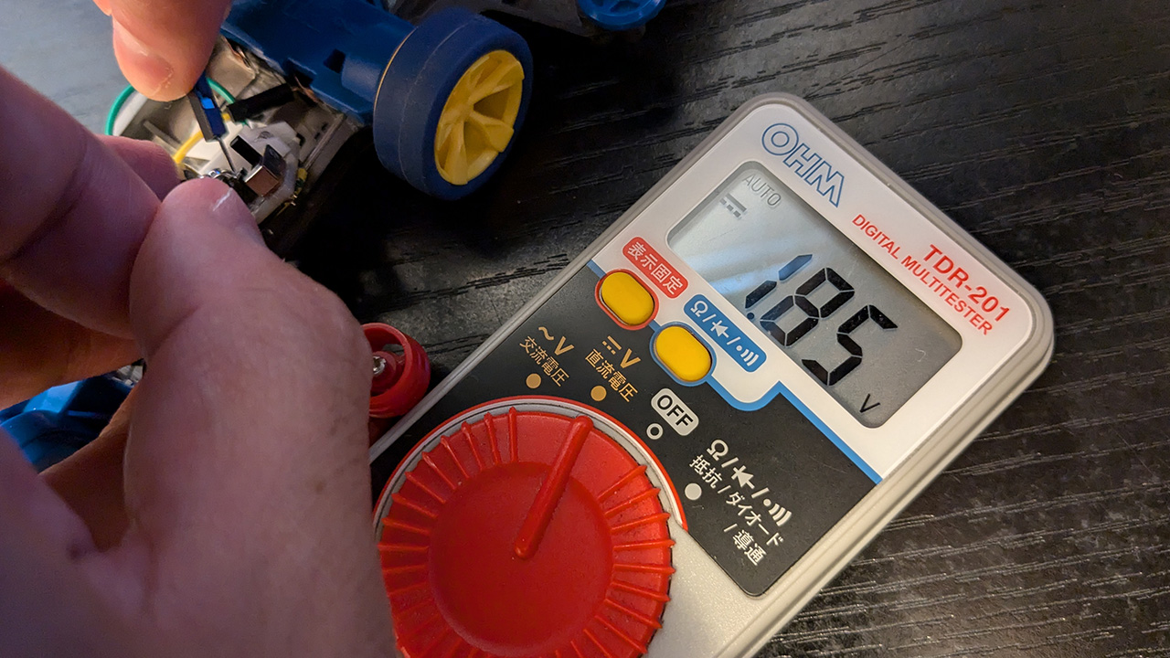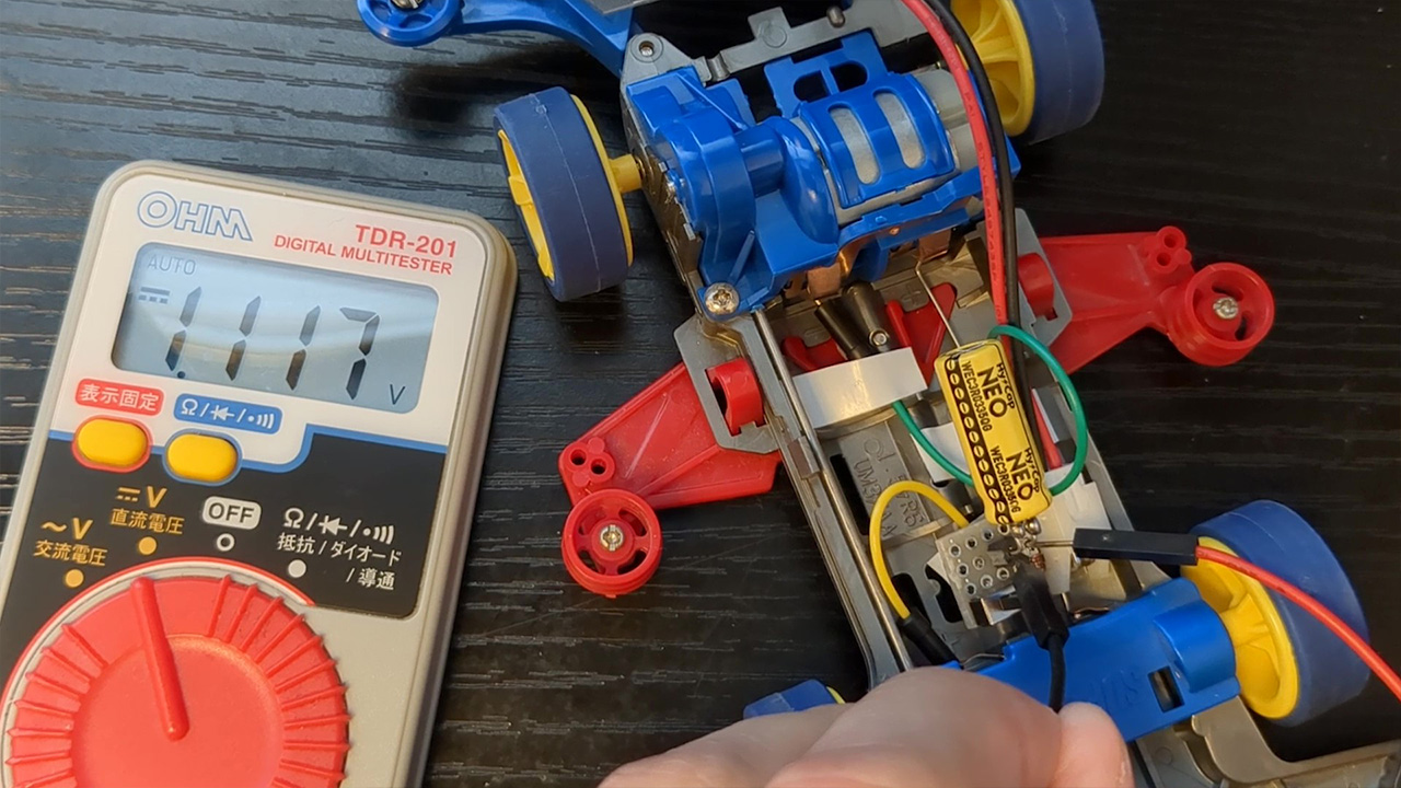 一気にミニ四駆のモーターへと電流が流れ込み、ぐぃーんと走り出す予定です。