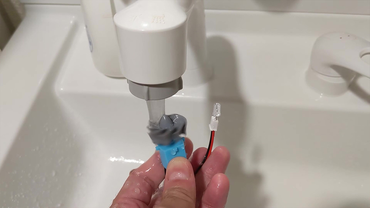LEDはごくわずかな電気を流すだけで点灯するので、水道の水圧程度では全くパワーが足りていないようです。