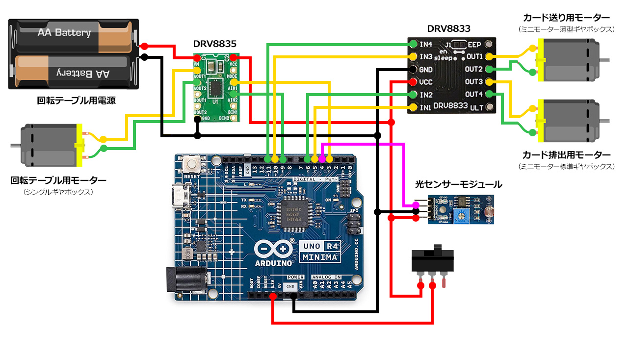 カードを排出する位置までのテーブル回転は、時間(delay関数)で管理しています。