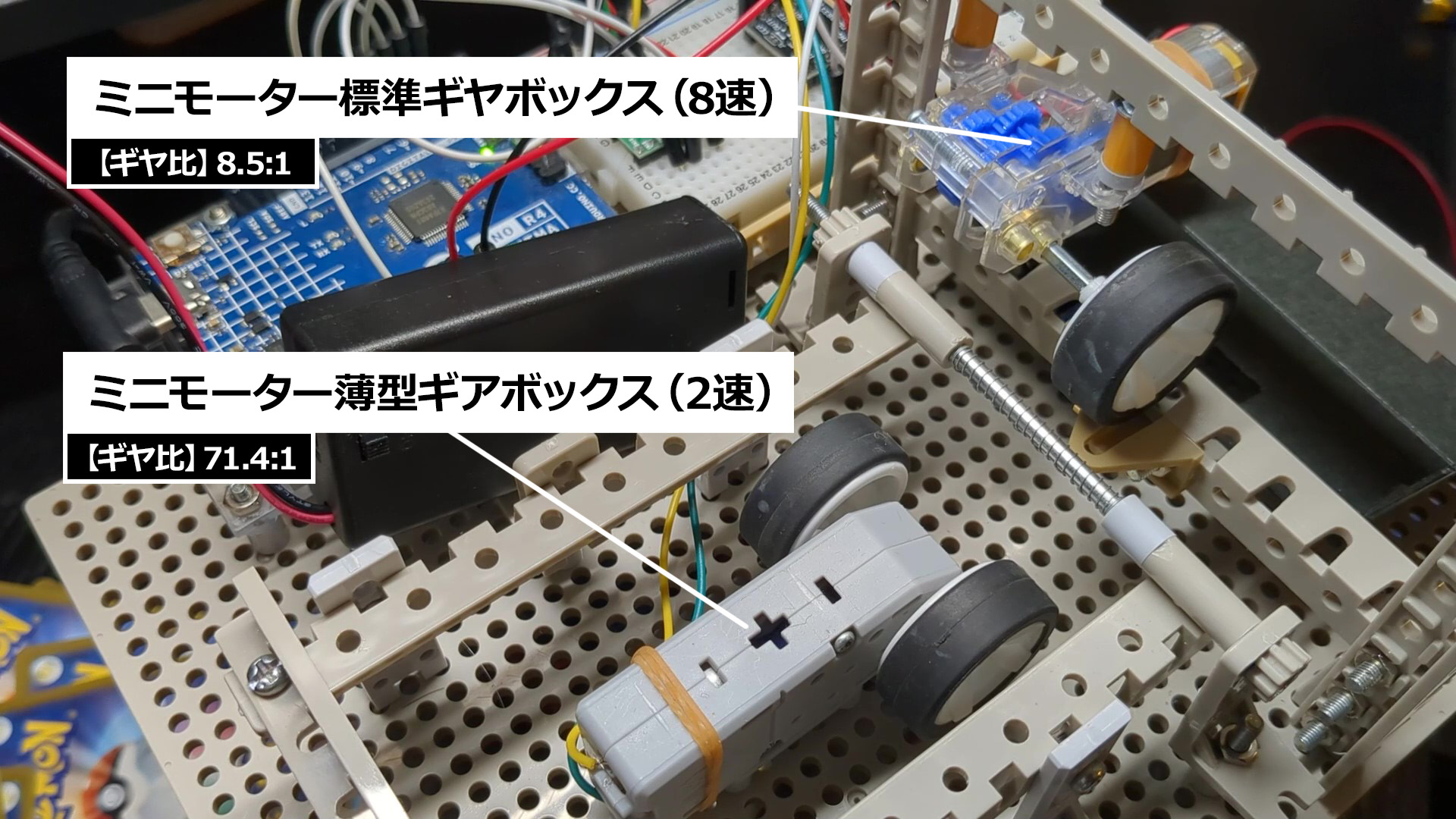 - 上:ミニモーター薄型ギアボックス(2速)ギヤ比 ⇒ 71.4:1