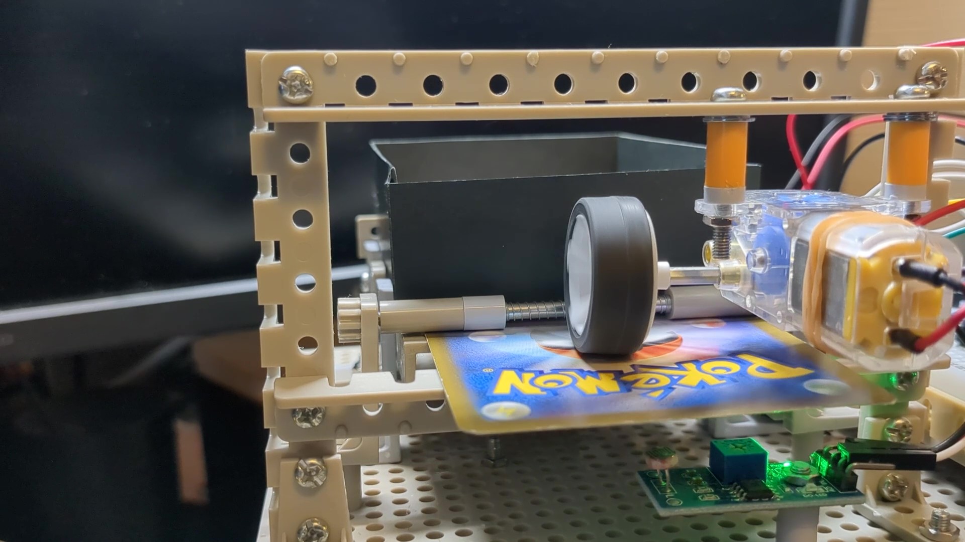 カード排出のタイミングになると、このモーターが回転し、カード一枚分の高さしかないゲートを通って、一枚だけが送り出されます。